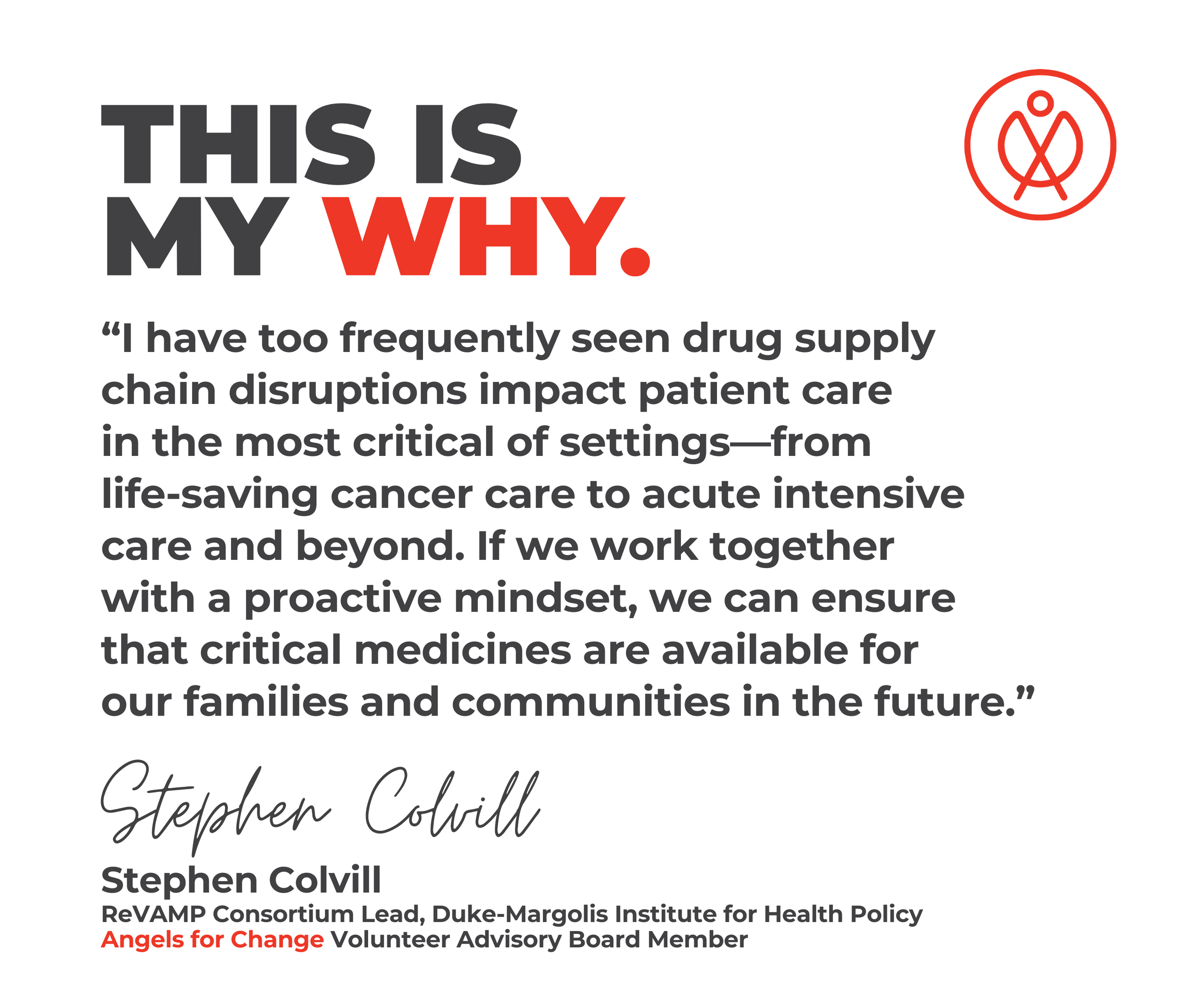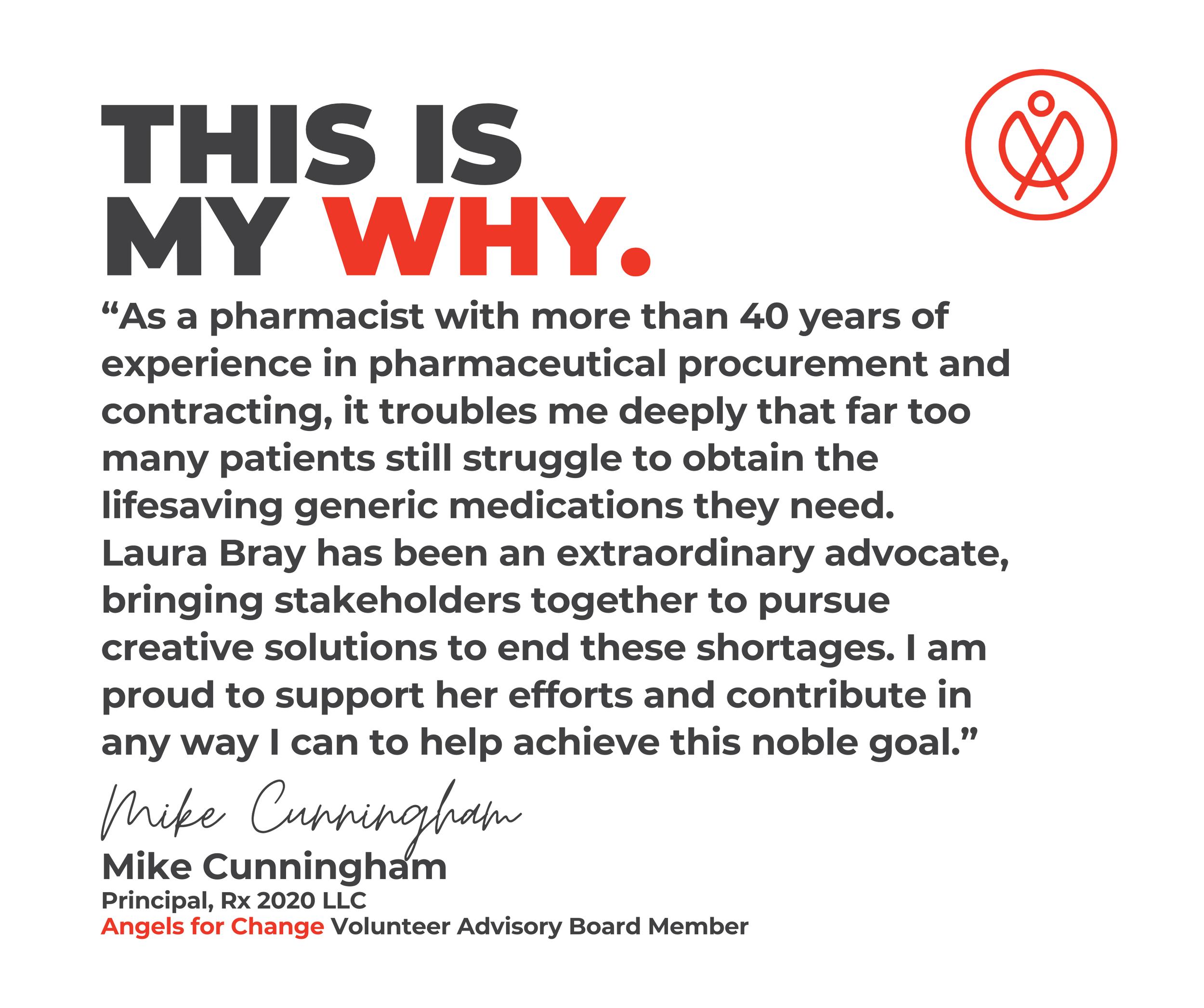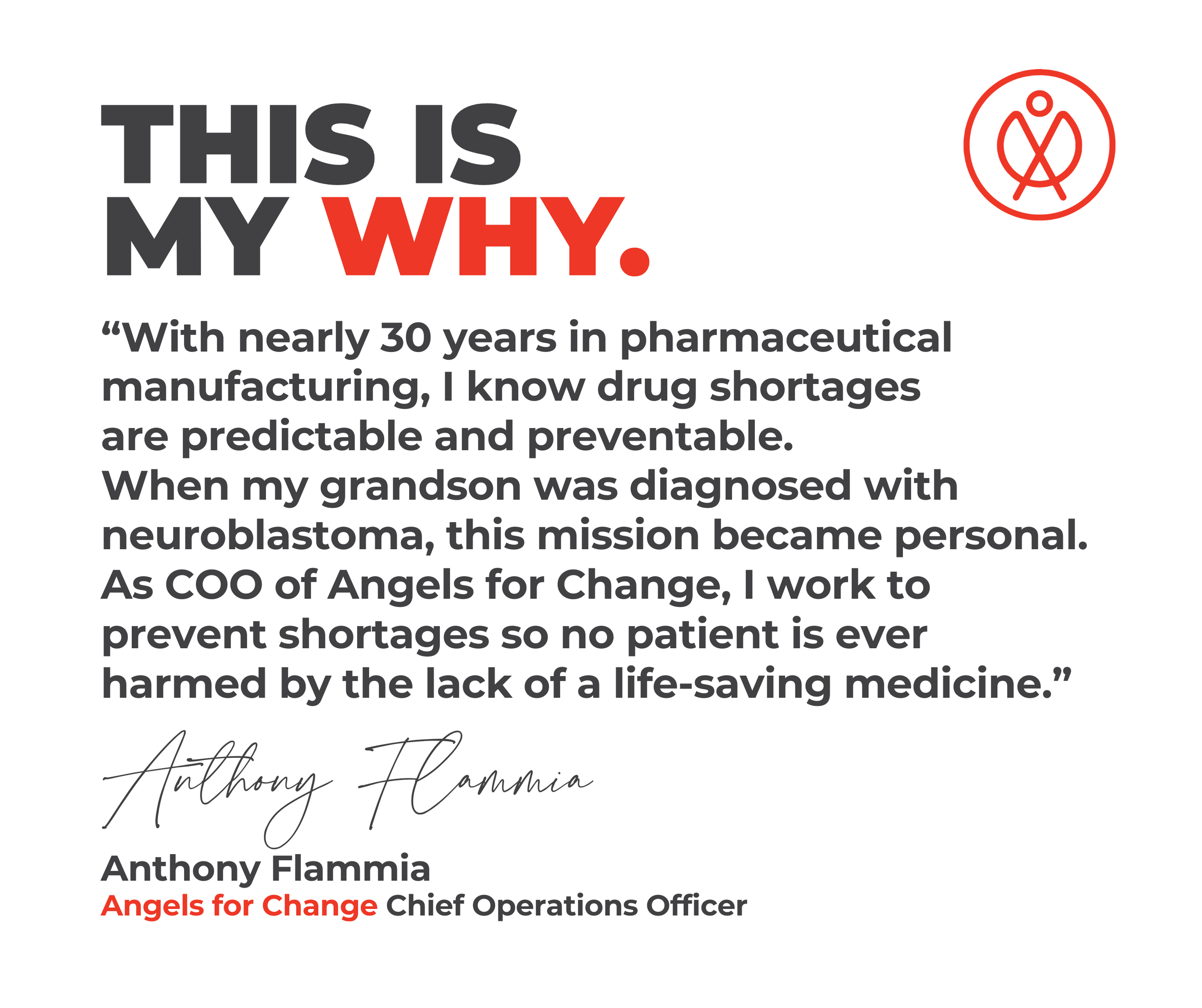 ““With nearly 30 years in pharmaceutical manufacturing, I know drug shortages are predictable and preventable. When my grandson was diagnosed with neuroblastoma, this mission became personal. As COO of Angels for Change, I work to prevent shortages so no patient is ever harmed by the lack of a life-saving medicine.””